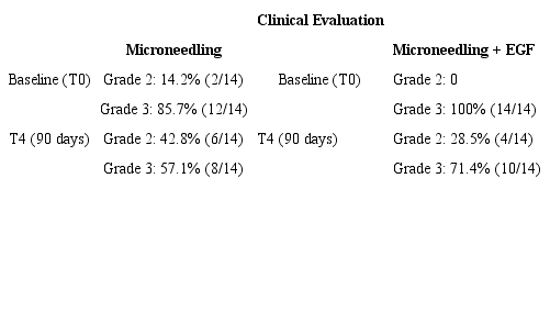 At time one (T1), corresponding to three to seven days after T0, we performed the first session of microneedling alone or associated with EGF. We conducted the second microneedling session, multispectral imaging assessment, clinical assessment, and quality of life assessment at time two (T2 - 30 days after T1). At time three (T3 - 60 days after T1) and time four (T4 - 90 days after T1), we performed multispectral analysis and clinical evaluation.The last quality of life assessment was performed applying the described questionnaires at time five (T5 - 180 days after T1). The same investigator conducted all these instruments for each volunteer.