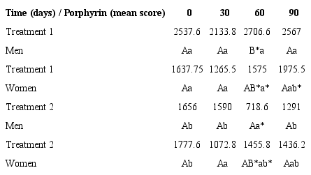 There was a reduction in porphyrin means, which may reflect a reduction in bacterial colonization by Cutibacterium acnes (C. acnes) (p=0.0296). Porphyrins means in group one in both sexes did not change significantly over time, but for treatment group two, they tended to decrease at time 60 (men) and time 30 (women). At time 60, the porphyrin means in both groups was significantly different for men, with a higher mean for group one than for group two, indicating that the use of EGF in group two was important to control the proliferation of C. acnes and thus reduce the total amount of porphyrins on the face (Table 3 and Figures 1A and 1B).