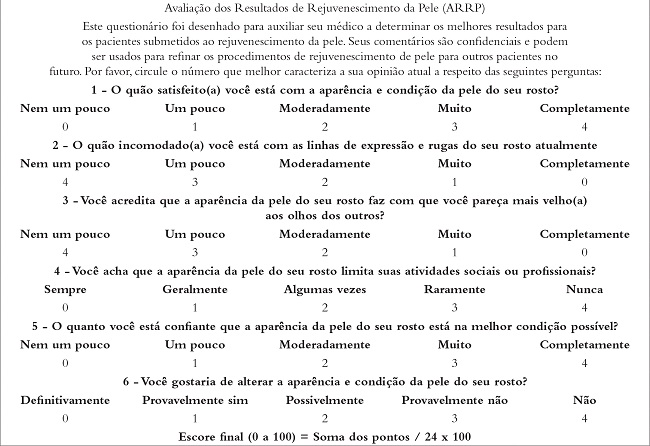 Conclusões: Os valores obtidos validam o questionário ARRP, traduzido para língua e cultura brasileiras, que tem como objetivo avaliar os resultados e o impacto na qualidade de vida dos procedimentos faciais em cosmiatria.