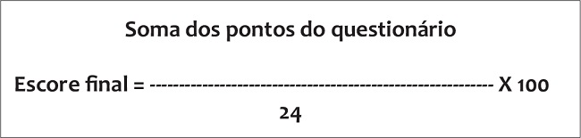 O SROE é um questionário que envolve apenas seis itens, de fácil compreensão e curto tempo de execução, portanto um diferencial importante para nossa escolha de questionário para ser submetido aos processos de tradução e validação. As opções de resposta são expostas em escala do tipo Likert, que pontua variando de zero a quatro pontos. O escore final do questionário ARRP (SROE traduzido) é calculado por meio da soma simples dos pontos das respostas marcadas pelo paciente, dividida por 24 e multiplicada por 100, gerando um escore que varia de 0 a 100 (Figura 2). Quanto maior esse escore, melhor é considerada a QDV do indivíduo.