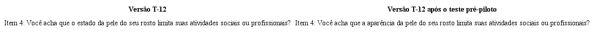 O processo de tradução seguiu as seis etapas descritas nos métodos, utilizando-se uma empresa privada do ramo de traduções com tradutores nativos, não nativos e juramentados, quando necessário. A versão consensual T-12 foi aplicada a dez pacientes do Ambulatório de Dermatologia Corretiva do Hospital Universitário Pedro Ernesto com o objetivo de avaliar a clareza da linguagem. Apenas uma palavra de um item do SROE (item 4 do questionário) foi questionada por dois pacientes e substituída por um sinônimo, sem nenhum prejuízo à semântica da frase (Quadro 2). O comitê especialista foi composto pelas autoras deste artigo, juntamente com a aprovação final da versão TR pelo autor do questionário original, Ramsey Alsarraff.