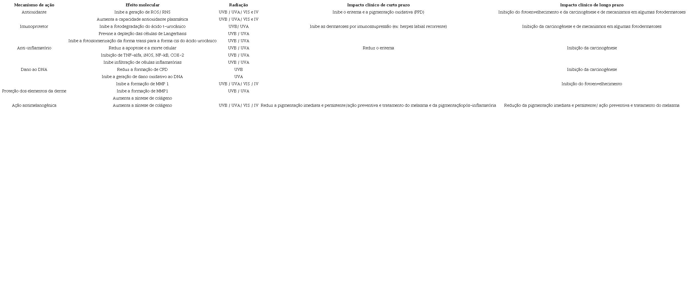 De forma didática, podemos destacar seis principais mecanismos: atividade antioxidante, ação fotoimunoprotetora, atividade anti-inflamatória, ação na proteção dos elementos da derme e atividade antipigmentar ou inibidora da melanogênese. O quadro 2 apresenta de forma didática os principais mecanismos de ação descritos na literatura