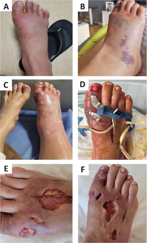 A paciente foi encaminhada ao setor de dermatologia devido ao inchaço não apenas do pé direito, mas também da perna, com necrose visível, bolhas e aquecimento significativo do membro inferior direito (Figura 1C).