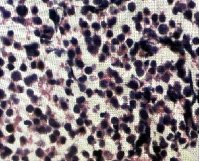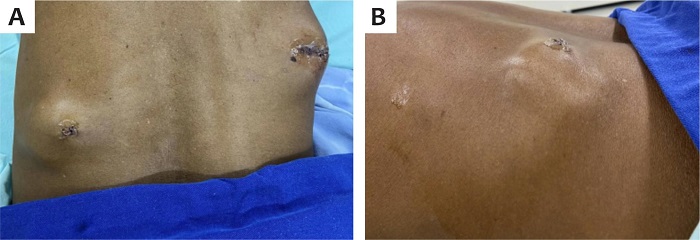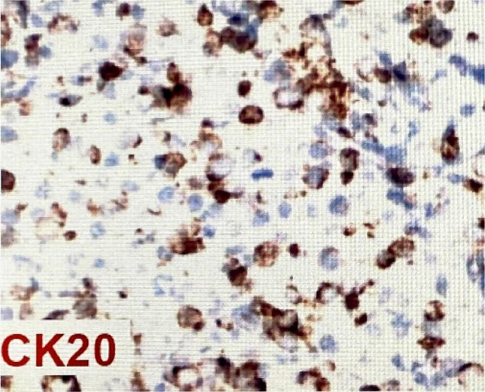 Homem negro, 78 anos de idade, jardineiro, apresentava dois nódulos no dorso, com expansão rápida há 3 meses. Negava febre, perda de peso ou outros sintomas associados. Possuía antecedentes de adenocarcinoma de próstata, tratado com orquiectomia em 2019. Ao exame dermatológico, observaram-se nódulos endurecidos, medindo 12 e 16 centímetros, localizados na região dorsal (Figura 1), sem linfonodomegalias associadas. O estudo histopatológico de ambos revelou células basaloides, com núcleo oval, citoplasma escasso e numerosas mitoses, achados sugestivos de carcinoma de células de Merkel (CCM). A imuno-histoquímica (IHQ) mostrou positividade para citoqueratina 20 (CK20), sendo negativa para antígeno prostático específico (PSA, de prostate-specific antigen) e para fator de transcrição de tireóide/pulmão (TTF-1, de thyroid transcription factor-1) (Figuras 2 e 3).