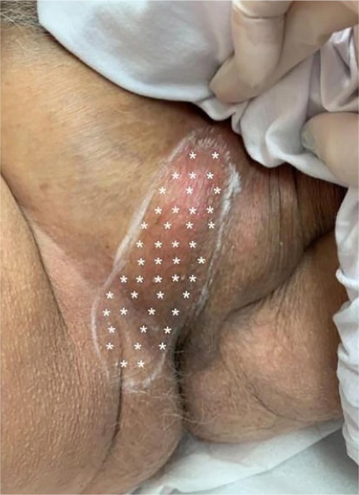Paciente do sexo masculino, 69 anos, apresenta quadro de desconforto, ardência e prurido superficial na bolsa escrotal e região inguinal direita, com evolução há aproximadamente 6 anos. Negava história de herpes genital ou outras afecções na região. Após investigação extensiva conduzida por médico urologista, não foi identificada etiologia específica. O paciente não apresentou melhora com o uso de medicações orais para dor crônica, incluindo anticonvulsivantes, prescritas por médico clínico. Ao exame físico, não foram observadas lesões cutâneas na região acometida, tampouco outras alterações, exceto pela presença de dois acrocórdons. Diante da refratariedade ao medicamento medicamentoso convencional, optou-se pela realização de tratamento com toxina botulínica (Dysport®), na dose total de 90 unidades (U). A aplicação foi realizada por via intradérmica, na proporção de 2 U por ponto, distribuídas em 45 pontos, com espaçamento de 0,5 cm entre eles, cobrindo toda a área sintomática, previamente demarcada com o auxílio do paciente, que indicou as regiões de maior desconforto, abrangendo a bolsa escrotal e a parte da região inguinal direita (Figura 1). Duas semanas após o procedimento, paciente relatou melhora significativa dos sintomas e expressou satisfação com a abordagem terapêutica, passando a não necessitar mais do uso de medicações orais para o alívio da dor. Além disso, não foram observados efeitos adversos relacionados à aplicação da toxina. O paciente manteve controle satisfatório dos sintomas por um período de 10 meses, utilizando exclusivamente essa intervenção, sem necessidade de terapias complementares durante o seguimento.