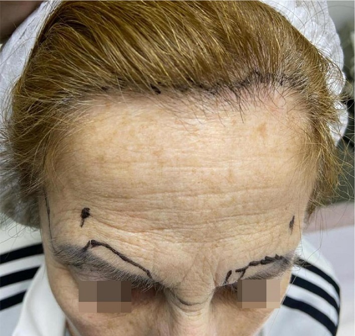 Com o paciente sentado, realiza-se a marcação da incisão. Delimita-se a região de máxima elevação no terço lateral com uma linha de concavidade superior inferiormente à sobrancelha, onde será realizado o descolamento no plano subcutâneo. Na região medial, onde se localizam os nervos supraorbital e supratroclear, demarca-se uma linha de concavidade inferior, acima da sobrancelha, que será o limite inferior do descolamento, com o objetivo de reduzir o risco de lesão nervosa e evitar a elevação excessiva da porção medial das sobrancelhas. Na região da glabela, marca-se uma linha de concavidade superior, que servirá de ponto de referência para o limite inferior do descolamento (Figura 1). Os limites laterais são marcados com uma linha vertical traçada na altura da crista temporal. A incisão superior é demarcada cerca de 5 mm posteriormente à linha de implantação frontal do couro cabeludo, apresentando um desenho irregular que simula o formato da linha de implantação natural (Figura 2). Realiza-se anestesia local tumescente com injeção de uma solução anestésica constituída por 80 mL de cloreto de sódio 0,9%, 20 mL de lidocaína 2% e 0,4 mL de epinefrina 1 mg/ mL. Essa solução é injetada no plano subcutâneo em toda a área previamente demarcada, e o volume total utilizado depende da extensão da região frontal. Em nossa experiência, esse volume varia de 60 a 80 mL. A incisão e o plano de dissecção conferem a nomenclatura ao procedimento, intitulado TSFBL. A incisão é realizada com lâmina 11, inclinada cerca de 10 a 20 graus em relação ao plano horizontal. Essa angulação permite seccionar os folículos pilosos em diferentes alturas, preservando os bulbos de parte deles, o que permitirá que os folículos mais anteriores cresçam à frente da cicatriz (Figura 3), promovendo uma camuflagem eficaz da cicatriz no couro cabeludo. Essas características da incisão também produzem bordas muito finas, contribuindo para um melhor resultado estético. A dissecção é realizada no plano subcutâneo, mantendo gordura no teto e no assoalho, criando um retalho lipocutâneo e evitando lesão do músculo frontal, localizado logo abaixo. Ao respeitar a linha de marcação mais alta na região proximal das sobrancelhas, evita-se a elevação excessiva de sua porção medial, enquanto a dissecção mais inferior da glabela e das porções laterais possibilita a elevação da cauda das sobrancelhas e a correção da ptose glabelar, devol vendo uma aparência mais jovem. Por se tratar de uma técnica subcutânea que possibilita visualização direta, há um menor risco de lesão dos troncos nervosos sensitivos principais da região da glabela em comparação às técnicas endoscópica e supraperiosteal. O limite lateral do descolamento não deve ultrapassar a crista temporal para evitar lesão do nervo temporal. Os septos do sistema músculo-aponeurótico superficial (SMAS) conectam o músculo frontal com a pele da fronte. Durante a dissecção no plano subcutâneo, ocorre o rompimento da maioria desses septos, o que resulta em uma melhora significativa das rítides frontais e glabelares. Embora os músculos depressores do supercílio possam ser seccionados sob visualização direta, optamos por não os abordar devido à ausência de superioridade nos resultados observados, assim como para não aumentar o risco de complicações. Após a conclusão da dissecção, o retalho é tracionado sobre o couro cabeludo e três incisões verticais são realizadas (back cut): uma na região central da testa, que corresponde inferiormente à glabela; e duas incisões paramedianas, que correspondem ao ponto de elevação máxima das sobrancelhas, frequentemente coincidentes com uma linha vertical traçada a partir do limbo corneal lateral. O comprimento dessas incisões pode variar de 15 a 30 mm, dependendo do posicionamento das sobrancelhas, da distância entre o couro cabeludo e as sobrancelhas e da experiência do cirurgião. Em nossa experiência, um comprimento entre 20 e 25 mm é adequado na maioria dos casos. O retalho é ancorado com pontos chave entre a parte distal dessas incisões e o couro cabeludo, utilizando suturas simples com fio de nylon 5.0 (Figura 4). Em seguida, o excesso de pele é removido com lâmina 11, seguindo o mesmo desenho e angulação da incisão no couro cabeludo, e as bordas são unidas delicadamente através de pontos simples com fio de nylon 5.0 (Figura 5). O procedimento é finalizado com curativo compressivo, e o paciente é reavaliado em até 48 horas. Após esse período, não é necessário refazer o curativo. As suturas são removidas após 10 a 14 dias (Figura 6).