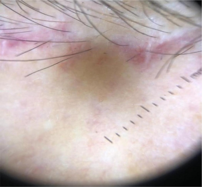 Existem diversas alternativas cirúrgicas para o tratamento da ptose das sobrancelhas, que podem ser didaticamente divididas em técnicas sob visualização direta, transblefaroplastia e endoscópica. As técnicas sob visualização direta se diferenciam conforme o posicionamento da incisão, sendo realizadas com excisões logo acima das sobrancelhas (técnica de Castañares), no meio da fronte, pré-triquial, coronal e transfolicular. O brow lift endoscópico é realizado no plano subgaleal ou subperiosteal e utiliza material de fixação óssea, resultando em incisões menores, menos edema, disestesia e alopecia no pós-operatório. Porém, essa técnica necessita de equipamento especializado, de maior custo, apresenta uma maior curva de aprendizado e seus resultados são menos duradouros em relação aos métodos diretos, pois o grau de elevação é determinado pela liberação e fixação do retalho, sem excisão direta de pele.1 É particularmente indicada quando há assimetria das sobrancelhas.2 A abordagem transpalpebral consiste na ancoragem ao periósteo dos tecidos da sobrancelha, dos músculos e da gordura subcutânea através da incisão de uma blefaroplastia superior. Pode ser realizada no intraoperatório de uma blefaroplastia superior nos casos em que um brow lift tradicional não estiver planejado. Mokhtarzadeh et al., avaliando 98 pacientes submetidos a fixação interna durante blefaroplastia, identificaram uma elevação média da posição central/lateral das sobrancelhas entre 1,47 e 2,29 mm durante seguimento de 4-5 meses.3 O brow lift direto inclui variações de incisões elípticas bilaterais logo acima das sobrancelhas (incluindo a técnica de Castañares), escondendo a cicatriz junto aos fios, ou incisões mediofrontais com o disfarce das cicatrizes nas rítides horizontais da fronte. Esses dois tipos têm indicação especial para pacientes com linha de implantação capilar instável. A técnica pode ser modificada para abordar apenas a ptose lateral ou para compensar assimetrias. Tais técnicas podem abaixar a linha de implantação capilar ao encurtar a fronte. A dissecção no plano subcutâneo pode ser realizada medialmente com o objetivo de melhorar as rítides glabelares, mas não há melhora das rítides frontais e a cicatriz pode ficar evidente por um período longo.3 O brow lift coronal, uma técnica aberta que usa uma incisão de orelha a orelha através do couro cabeludo, eleva a linha de implantação capilar, mas pode causar alopecia e lesão neural. A abordagem pré-triquial consiste em posicionar a incisão na fronte, fora e logo abaixo do couro cabeludo. Ao contrário do brow lift coronal, essa técnica abaixa a linha de implantação capilar ao encurtar a fronte, mas pode acarretar as mesmas complicações que os demais métodos, com a desvantagem adicional de deixar uma cicatriz mais evidente. A abordagem transfolicular possibilita abaixar a linha de implantação capilar, reduzir a altura da fronte e atenuar rítides frontais e glabelares, elevando todo o terço superior, com melhora da pseudodermatocálase. Caso o paciente ainda apresente excesso de pele na pálpebra superior após o TSFBL, é possível realizar uma blefaroplastia superior no mesmo tempo cirúrgico para complementação dos resultados. Em nossa experiência, preferimos realizar a blefaroplastia em um segundo momento para obtermos uma avaliação mais fidedigna da quantidade de pele excedente. O resultado estético da cicatriz é bastante satisfatório, resultando em uma linha hipocrômica fina, evidente apenas ao pentear os cabelos para trás (Figura 7). De forma geral, todas as técnicas cirúrgicas de elevação das sobrancelhas possuem baixa incidência de complicações, sendo as mais comuns hematoma, lesão de nervos sensitivos e motores cursando com disestesia, paresia, assimetria, alopecia e cicatrizes inestéticas. Os dados atualmente disponíveis na literatura não demonstram superioridade de uma técnica em relação a outra ou de técnicas endoscópicas em relação a técnicas sob visualização direta.4,5
