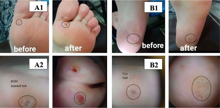 Os pacientes foram submetidos à coleta completa da história clínica, incluindo nome, idade, sexo, endereço, informações de contato, tempo de duração das verrugas e eventuais tentativas terapêuticas anteriores, bem como seus desfechos. Em seguida, realizou-se um exame clínico detalhado das verrugas, com avaliação do tamanho, localização, características de superfície e número de lesões. As lesões de cada paciente foram distribuídas aleatoriamente em dois grupos: o Grupo A recebeu TCA tópico a 40%, e o Grupo B recebeu KOH tópico a 40%. As soluções tópicas foram aplicadas com hastes de algodão e permaneceram sobre as lesões por 1 a 2 horas. Ambos os tratamentos foram realizados no mesmo dia.