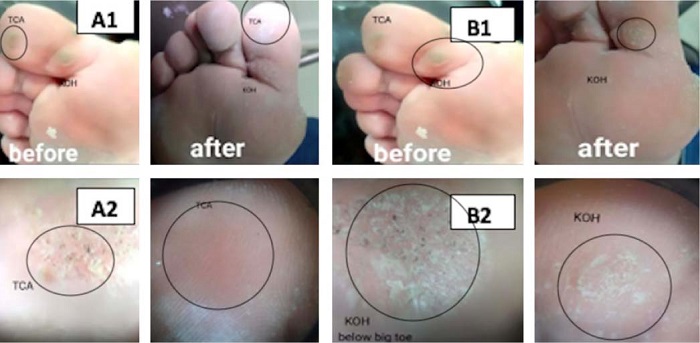 A eliminação dermatoscópica completa das verrugas, sem recorrência durante o período de acompanhamento de 2 meses, foi alcançada em 88,6% dos pacientes do grupo KOH, em comparação a 66,7% no grupo TCA.