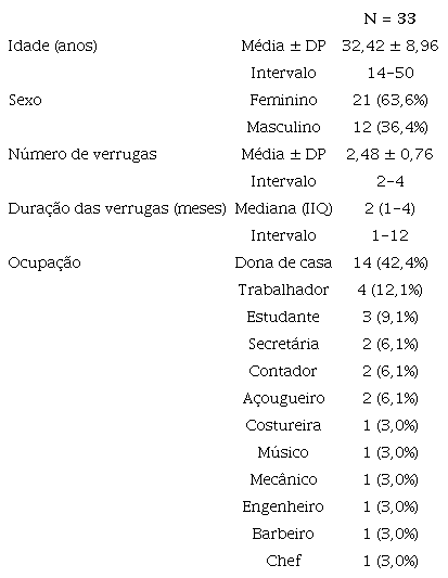 O estudo incluiu 33 indivíduos: 12 homens (36,4%) e 21 mulheres (63,6%), todos com múltiplas verrugas plantares. A idade dos participantes variou de 14 a 50 anos, com média de 32,42 ± 8,96 anos. A duração das verrugas variou de 2 a 4 meses, com média de 2,48 ± 0,76 meses (Tabela 1).