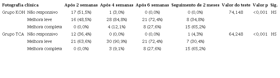 Foi observada melhora estatisticamente significativa na avaliação clínica fotográfica ao longo das sessões de tratamento em ambos os grupos (KOH e TCA), com valores de p < 0,001 e 0,001, respectivamente (Tabela 2).