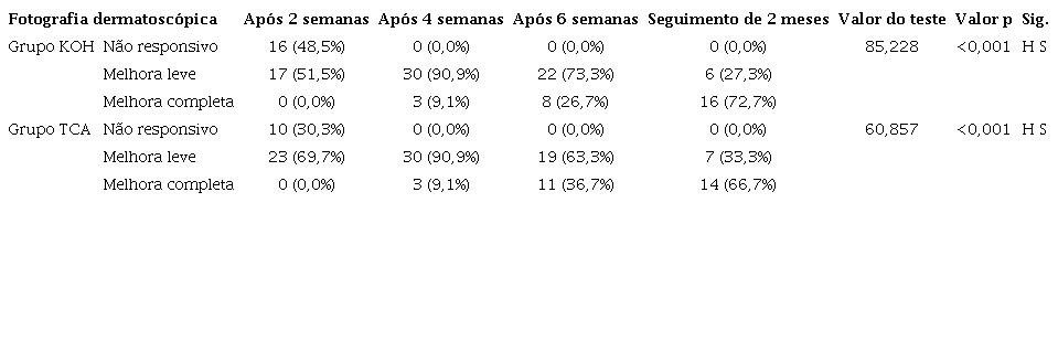 Ambos os grupos apresentaram melhora estatisticamente significativa nas avaliações clínicas e dermatoscópicas ao longo das sessões de tratamento, com valores de p < 0,001 para o grupo KOH e 0,001 para o grupo TCA.