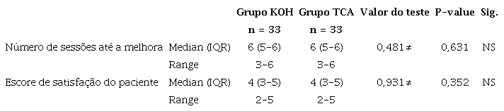 Não houve diferença estatisticamente significativa entre os grupos quanto ao número de sessões necessárias para melhora ou aos escores de satisfação dos pacientes. Ambos os grupos apresentaram mediana de seis sessões (IIQ 3-6) (Tabela 4).