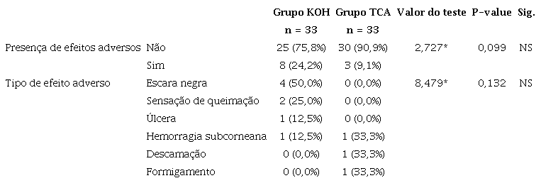 Não foi observada diferença estatisticamente significativa entre os grupos KOH e TCA quanto à incidência e ao tipo de efeitos adversos, com valores de p de 0,099 e 0,132, respectivamente.