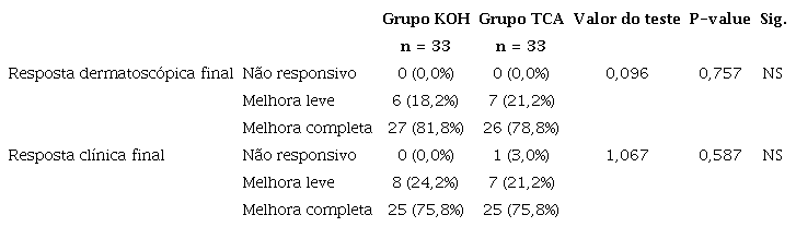 Não foi observada diferença estatisticamente significativa entre os dois grupos em relação às respostas clínicas e dermatoscópicas finais. Na avaliação dermatoscópica final, a melhora completa foi registrada em 81,8% dos pacientes do grupo KOH e em 78,8% do grupo TCA.