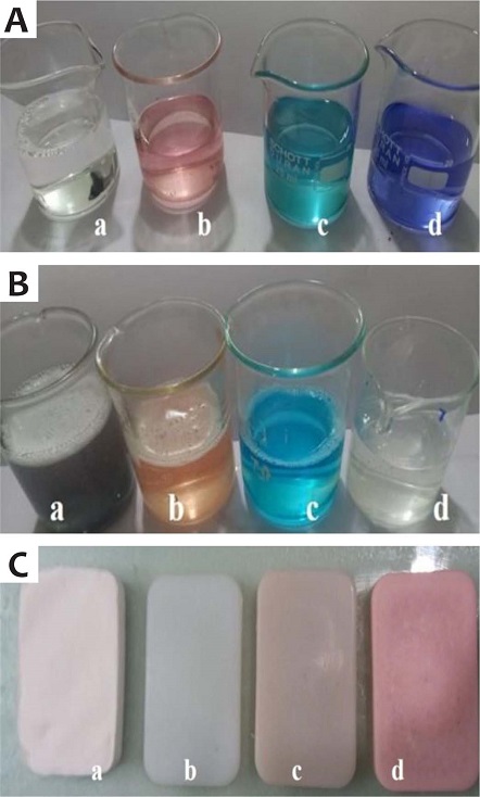 Uma série de testes experimentais foram realizados para otimizar as formulações laboratoriais de sabonete, gel de limpeza facial antiacne e gel desinfetante para as mãos. As composições finais foram desenvolvidas com base nas combinações de ingredientes de melhor desempenho (Tabela 1). Foram incluídos quatro tratamentos controle no processo de formulação dos três produtos: (1) uma formulação sem pigmento, (2) uma formulação contendo apenas FC (1,5 g), (3) uma formulação contendo apenas FE (1,5 g) e (4) uma formulação contendo uma combinação de ambos os pigmentos (1,5 g no total) (Figura 2).24-26