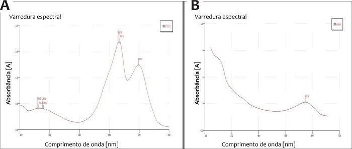 O espectro de absorção dos pigmentos purificados foi determinado por varredura da amostra em comprimentos de onda variando de 300 a 750 nm com um espectrofotômetro Specord 200 (Analytik Jena, Alemanha). As concentrações de FC e FE foram calculadas a partir das medições da absorbância a 620 e 650 nm (para FC) e 565 nm (para FE), utilizando equações padrão.A pureza dos pigmentos foi avaliada em cada etapa calculando as razões de pureza: A620/A652 para a FC e A555/A280 para a FE (Figura 1).22
