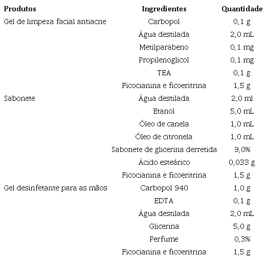 Resultados: Os resultados mostraram que a ficocianina e o conteúdo combinado de pigmentos foram maiores no gel antiacne e sabonete, enquanto a ficoeritrina e a concentração total de pigmentos foram maiores no gel desinfetante.