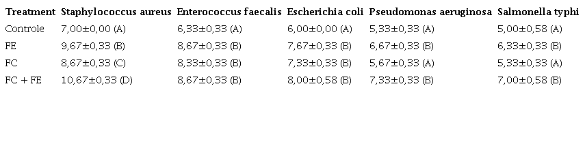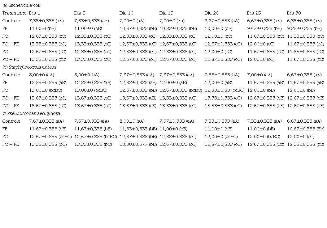 De acordo com a ANOVA de uma via e o teste de Tukey dos diâmetros das ZI, a maior atividade antimicrobiana contra S. aureus foi observada nos géis enriquecidos com FC + FE. Para E. faecalis e E. coli, não foi observada diferença estatisticamente significativa nas ZI entre os géis tratados com pigmentos. Entretanto, os géis contendo FE e FC + FE apresentaram a maior inibição contra P. aeruginosa e S. typhi (Tabela 3).