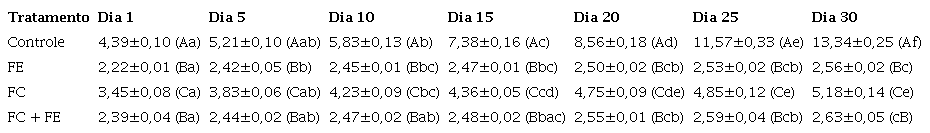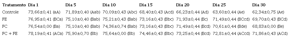 De acordo com a ANOVA de uma via e o teste de Tukey, a atividade antioxidante diminuiu significativamente ao longo do período de 30 dias. No último dia, a maior atividade antioxidante foi observada nos géis enriquecidos com FE e FC + FE (Tabela 4).
