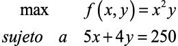 cuyos precios son 5 y 4 pesos, que tiene preferencias modeladas por la función de utilidad f (x,y)=x2y, con un nivel de ingreso igual a 250 pesos. El problema queda planteado como