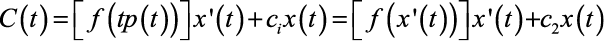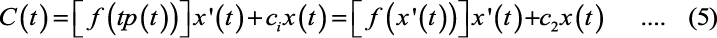 Entonces el costo total de producción en cualquier tiempo t es la suma del costo de producción, más el costo de inventario. El costo de producción está dado por el producto del costo de producción unitario multiplicado por la cantidad producida en el intervalo, mientras que el costo de inventario es el producto del costo unitario c2 por la cantidad producida hasta ese momento x(t).