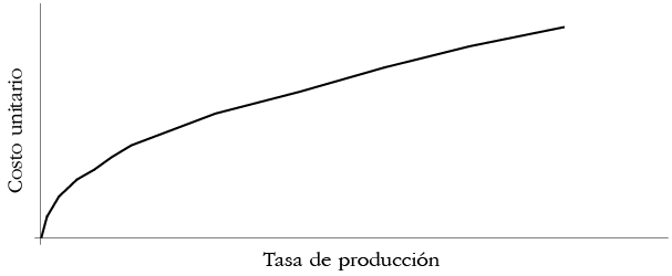 ya que producir los bienes a una mayor tasa (velocidad) saldrá más costoso que hacerlo a una tasa menor, por lo tanto se trata de una función creciente: