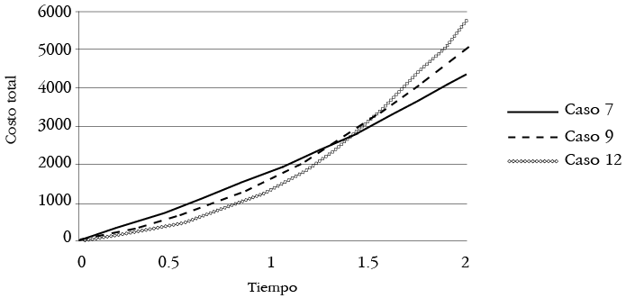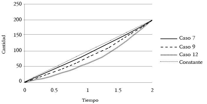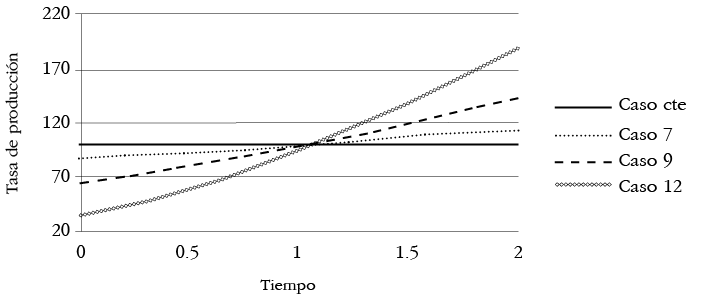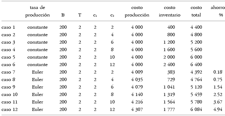Caso 7, el costo total sería de 4 392, con un costo de producción de 4 009 y el costo de almacenaje se reduce a 383; se observa que aunque hay un incremento en el costo de producción, disminuye el costo de almacenaje, obteniéndose una reducción del 0.18%; pero si se incrementa el costo de almacenaje, los casos 3 y 9, en que c1 y c2 toman los valores 2 y 6 respectivamente, el costo total a tasa de producción constante es de 5 200 y disminuye a 5 120 utilizando la tasa calculada con la ecuación de Euler, con una disminución de 1.54%; para los casos 6 y 12 con (c1, c2) = (2, 12) el ahorro es de 4.94%. En todos los casos se obtiene una disminución significativa del costo de almacenaje (de hasta casi 30%) aunque también se observa un incremento en el costo de producción que no sobrepasa al 10%, obteniéndose en todos los caso reducciones en el costo total de producción.