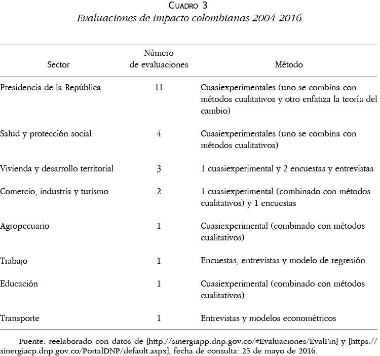 El Sistema Nacional de Evaluación de Resultados de la Gestión Pública (Sinergia) fue creado en 1994 y encargado al Departamento Nacional de Planeación (DNP), que depende directamente de la Presidencia. Sus evaluaciones cubren los denominados eslabones de la cadena de valor, al final de la cual se ubican las relativas a impacto. No fue posible encontrar una definición específica de este tipo ni una exposición de los métodos disponibles.
