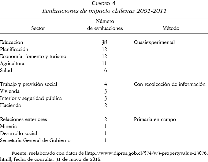 A diferencia del caso colombiano, en Chile las evaluaciones de impacto son más numerosas y muestran mayor diversificación por sectores. Su opción metodológica es claramente cuasiexperimental y su sistema de evaluación ha sido considerado robusto y muy avanzado por el Banco Mundial;14 sin embargo, este organismo recomendó que se complemente, con base en la theory-based evaluation, para poner especial atención en las relaciones causales. Sus publicaciones sobre el tema también son muy pocas,15 en cambio tiene diversas maestrías y diplomados, dos de ellos especializados en evaluación de impacto general y ambiental (Universidad de Chile y de Lagos, respectivamente).