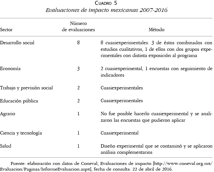 Si bien México cuenta con más publicaciones sobre evaluación que los dos países previos, no se localizó ninguna especialmente referida a evaluación de impacto, sólo algún apartado en trabajos más amplios.22 Sus pocos programas formativos incluyen algún componente de impacto, con enfoques variados.