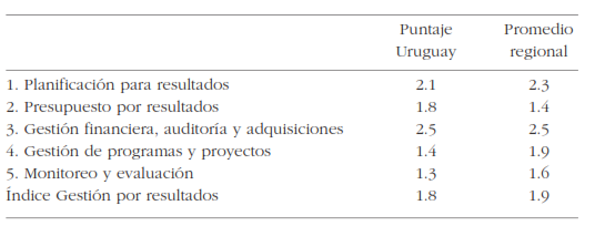El Banco Interamericano de Desarrollo (BID)13 ha estudiado los avances en la puesta en marcha de herramientas de gestión por resultados en América Latina con base en cinco componentes. De éstos, los que presentan una menor calificación en Uruguay son el monitoreo y la evaluación, y en contraposición están aquellos relacionados con el núcleo más duro y procedimental, como la gestión financiera, auditoría y adquisiciones, donde alcanza sus mayores niveles de desarrollo.
