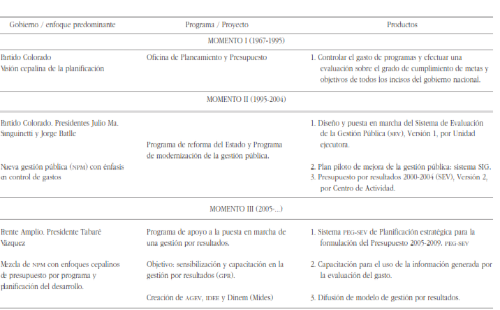 El primer periodo se ubica en 1967 con la introducción del presupuesto por programa y la evaluación de los incisos en el Presupuesto Nacional. Con este fin se creó la Oficina de Planeamiento y Presupuesto (OPP) como entidad encargada de asistir al Poder Ejecutivo en la formulación de planes y programas de desarrollo y, en ese marco, controlar el gasto de dichos programas. Asimismo, efectuar una evaluación sobre el grado de cumplimiento de metas y objetivos de todas las áreas del gobierno nacional.16