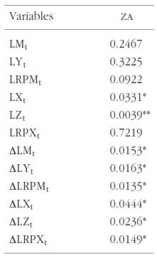 Donde X, Z y RPX representan las exportaciones, el PIB mundial, y los precios relativos de las exportaciones (Pd/PfE), respectivamente. RPX es la razón del índice de precios de las exportaciones al índice de precios de las importaciones. Los resultados de la prueba ZA para las exportaciones y el PIB mundial indican que son estacionarias cuando se encuentran en niveles; excepto los precios relativos de las exportaciones, ésta última variable es estacionaria cuando se encuentra expresada en primeras diferencias (Cuadro 1).