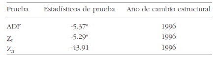 * Indica rechazo de la hipótesis nula: presencia de raíz unitaria con choque estructural en el intercepto o en la tendencia, al 5% de significancia.