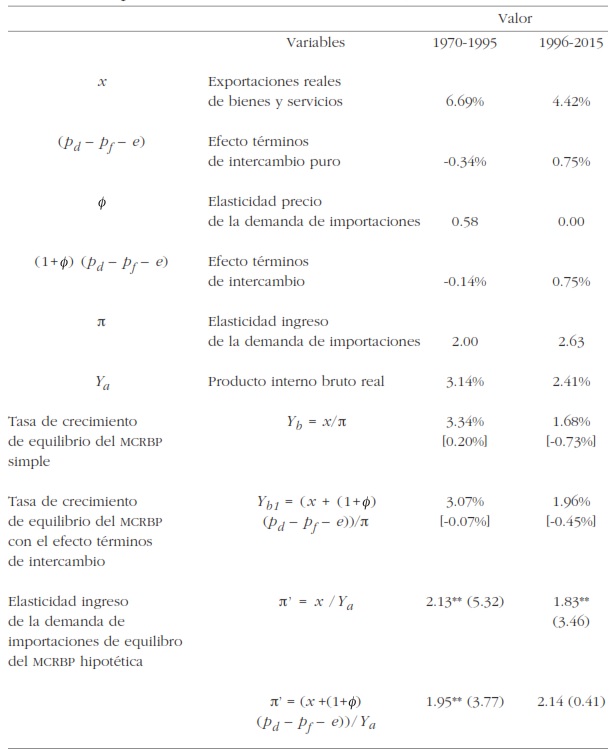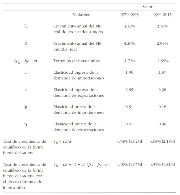 Se encontró que la tasa de crecimiento de equilibrio del MCRBP con el efecto términos de intercambio (3.07% anual) se encuentra muy cercana a la tasa real de crecimiento promedio (3.14% anual) de la economía de los Estados Unidos durante el periodo 1970-1995. Para el periodo 1996-2015, la tasa de crecimiento de equilibrio del MCRBP con el efecto términos de intercambio (1.96% anual) también se encuentra muy cercana a la tasa real de crecimiento promedio (2.41% anual). Así, nuestro análisis encuentra apoyo sustancial para el MCRBP como una hipótesis de largo plazo.