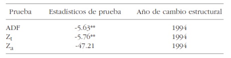Los resultados de la prueba GH se muestran en el Cuadro 4, éstos sugieren que la función de demanda de exportaciones es cointegrada al 5% de significancia con la presencia de un cambio estructural. El estadístico t de la prueba ADF es -5.63 y el de Zt es -5.76, ambos son mayores en valor absoluto que el valor crítico 5.50, el cual denota significancia al 5%. Las estimaciones muestran que el año de cambio estructural es 1994.