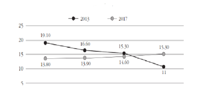 La orientación sexual es una de las cuatro causas de mayor discriminación junto con la posición socioeconómica, el color de la piel y el nivel educativo. Una comparación de los resultados globales de la encuesta de 2013 respecto de la realizada en 2017, muestra que la discriminación por preferencia sexual no se ha modificado, mientras que la discriminación por posición socioeconómica y por el color de la piel disminuyó varios puntos porcentuales (Gráfica 1).