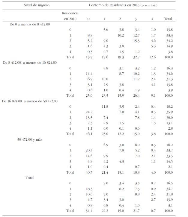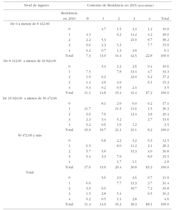 Con la finalidad de caracterizar los flujos de migrantes, la población migrante se clasificó por su nivel educativo y por su nivel de ingresos. Para establecer las categorías de las variables cuyos cruces se presentan en el Cuadro 4, se consideraron pertinentes cuatro cortes tanto en el ingreso como en la escolaridad, además de los cinco que definen los contornos de residencia en 2010 y 2015, los cuales son fijos. Esto se hizo con el fin de probar estadísticamente la relación entre las variables mencionadas y con ello no sólo darle un soporte sólido al análisis de los datos que se hace, sino a la hipótesis de investigación planteada. Los cortes considerados permitieron no violar los supuestos teóricos del estadístico ji_cuadrada, utilizado para probar la hipótesis mencionada. Al probar la hipótesis estadística de que existe una relación entre los niveles de escolaridad, ingreso y los cambios de residencia entre los contornos, en cada una de las cuatro partes del Cuadro 4, ésta resultó significativa para los niveles de la probabilidad de rechazo del 0.01 y 0.05.