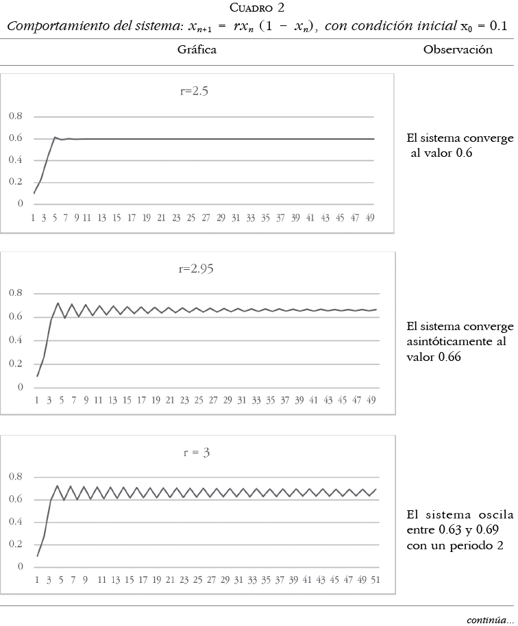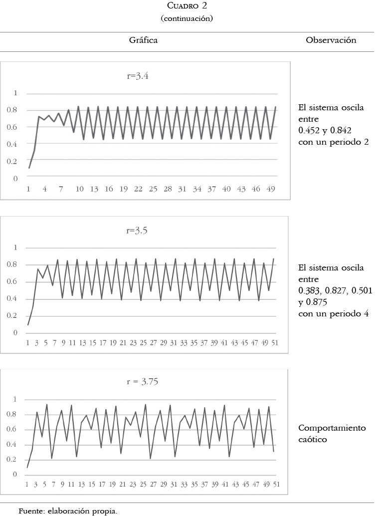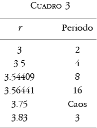 En el Cuadro 3 se observa que desde un patrón que converge a un valor, después oscila entre dos valores, periodo 2, o tres valores, periodo 3 o 4, y así hasta llegar a un comportamiento caótico dependiendo del valor de r.