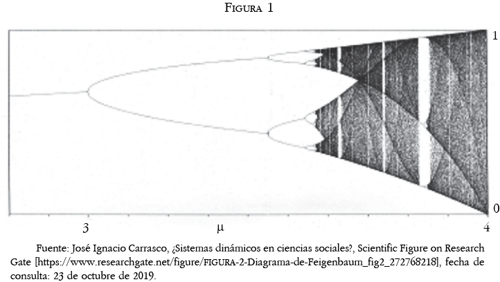 En la Figura 1 se presenta el diagrama de bifurcaciones de Feigenbaum del comportamiento de la función logística, donde se observa que el estado final del sistema varía en función del valor del parámetro r.