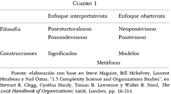 Entonces se tienen dos enfoques: el interpretativista y el objetivista sopor-tados cada uno por cuerpos filosóficos; el primero correponde al posestruc-turalismo y posmodernismo, mientras que el objetivista, por el positivismo y el neopositivismo. En el primer enfoque se generan significados y metáforas. En el segundo se contruyen modelos.