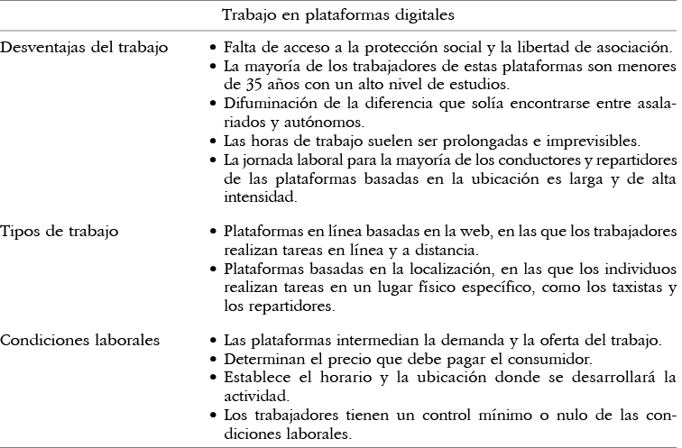 Estos ejemplos son evidencias de que el trabajo en las plataformas es precario e inestable y lleva a los trabajadores a plantear la exigencia de sus derechos. Por supuesto que las plataformas se han negado a reconocerlos. A pesar de las dificultades, poco a poco los colaboradores han iniciado una lucha a escala internacional por que sean reconocidos sus derechos como trabajadores.16 En el siguiente cuadro se sintetizan las desventajas del trabajo en plataformas digitales, los tipos y condiciones laborales.