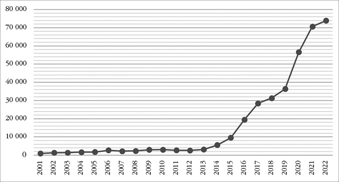 De 2013 a 2014 se incrementaron 16% las muertes vinculadas con prescripciones de opioides y también se elevaron 28% los decesos relacionados con abuso de heroína. De igual manera, las muertes que involucraban sobredosis de fentanilo y/o tramadol se dispararon 79% según el Centro Nacional de Estadísticas de Salud (NCHS por sus siglas en inglés).6 Estos datos mostraban un avance desmedido de la crisis de los opioides y sus terribles consecuencias para la sociedad estadounidense, especialmente entre los sectores juveniles de la población y también las comunidades más marginadas. Aunque los casos de sobredosis de fentanilo ya se habían documentado cuando menos desde la década de 1980, fue en el 2014 cuando comenzó un incremento considerable de las muertes por sobredosis asociadas con este opioide, como se muestra en la gráfica 1. Para el 2015, el fentanilo7 se convirtió en la causa número uno de muertes por sobredosis, desplazando a sustancias como la heroína o las metanfetaminas.
