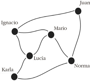 Si se considera que los nodos o vértices representan a individuos, las aristas pueden configurar vínculos que los unen. Así, un grafo G = {V, X} puede representar a un conjunto de actores sociales vinculados entre sí, donde:
