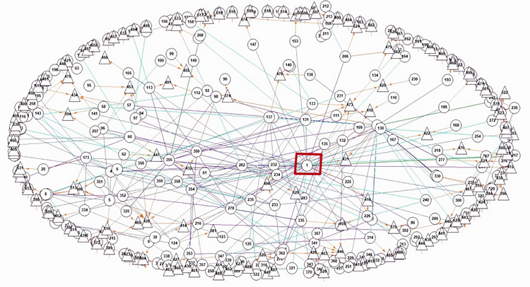 El nodo “p3” es adyacente a otros cuatro puntos (p1-p5). Cada uno de ellos puede ser contiguo a sólo cuatro nodos. Por lo que este número es el máximo grado. Por tanto, “p3” es quien cumple esta característica. Ello provoca que tenga el mayor número de lazos posible. Por otra parte, los tipos de redes logran presentarse completas (visión general) o partidas (visión específica). Ambas pueden ser de dos tipos: de un modo (sólo se usa un tipo de nodo) o de dos modos o más (dos o más nodos). También, es necesario prestar atención a los tipos de relaciones: dirigidas (con una dirección recíproca entre actores) o no dirigida (una sola dirección particular).14