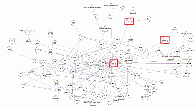 Cabe resaltar que los vértices representan los lazos. Sólo se analizaron los vínculos entre los mismos agentes del gobierno y las instituciones estatales. Se hallaron un total de 216 vinculaciones familiares. De éstas, 63% fueron históricas, 22% directas, 11% indirectas y 4% terciarias. También se encontraron 156 lazos amistosos. De éstos, 36% fueron cumpleaños, 29% eventos familiares, 21% comidas privadas, 8% mentoría, 5% compadrazgo y 1% socios. Por último, se encontraron 202 lazos entre titulares de gobierno y la institución que encabezaban en su momento.31
