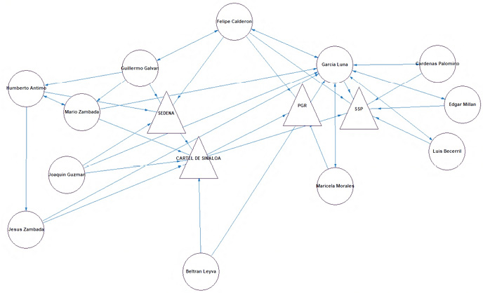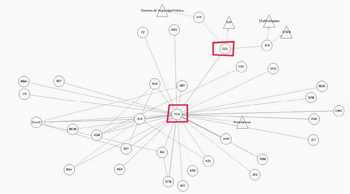 Es necesario mencionar que los círculos en la figura 12 representan a los actores y los triángulos a las instituciones y organizaciones. Como es posible apreciar, esta es una red típicamente jerárquica. En la cima se encuentra Felipe Calderón debido a que sus lazos con los exsecretarios García Luna y Galván Galván son de subordinación. Aparte, estos últimos tenían vinculación amistosa directa con el expresidente, aunque de baja intensidad y efímera (sólo comidas privadas). Ello originó que sus posiciones fueran fundamentales para establecer relación con el Cártel de Sinaloa.