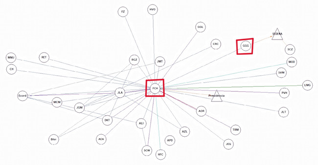 Como se aprecia en la figura 9, la red egocéntrica de Felipe Calderón (FCH) es típicamente modular de subtipo concéntrico. El actor aparece en el centro de la red y alrededor de él los demás nodos (actores e instituciones) se vinculan de forma dirigida y no dirigida, así como de modo directo e indirecto. Se resalta el nodo “GGL” que obedece Genaro García Luna (exsecretario de Seguridad Pública) con una vinculación directa amistosa de eventos privados con el expresidente. También se subraya el vértice “GGG” que advierte el nombre de Guillermo Galván Galván (exsecretario de la Defensa Nacional) con una vinculación directa de comidas privadas con Felipe Calderón. 32