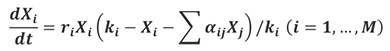 donde x y k son los vectores de la columna (Mx1) y A es la matriz de la comunidad, y cuyos elementos son los coeficientes de competencia.11